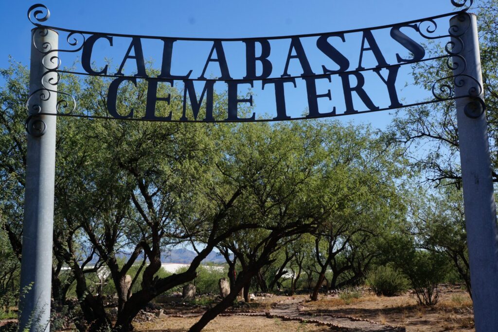 The Calabasas Cemetery is located off the East Frontage Road in Rio Rico just south of Exit 17, nestled between huge produce buildings. The original tall arc with the metal artwork name welcomes visitors.