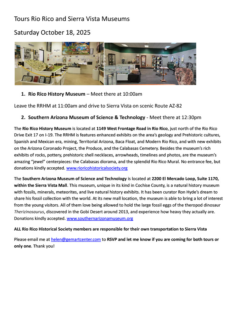Tour cost: Members $65, Non-Members $75, Students $40. Groups of 10 will receive 10% off. (Prepaid Reservations Required) Please mail checks to Rio Rico Historical Society, PO Box 4201, Rio Rico, AZ 85648 or pay online at www.RioRicoHistoricalSociety.org